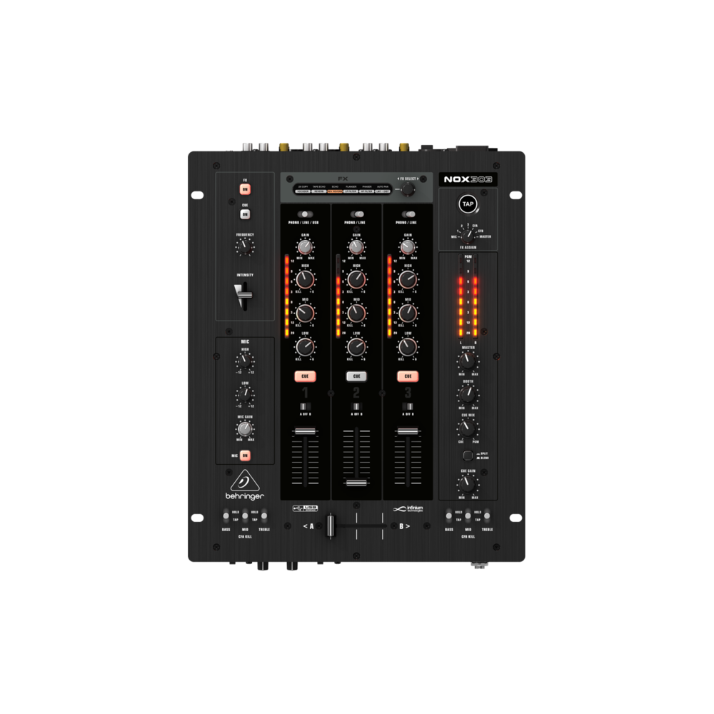 Серия DJ микшеров NOX специально создана для прямого подключения к компьютеру. - 45 мм infium "бесконтактный" оптический кроссфейдер с регулируемой "напряжённостью" и фейдером - Секция Beat-syncable FX с двумя параметрами контроля (назначаются на микрофон,1,2,3,CFA,CFB, или Master) - Встроенный USB-интерфейс для записи и воспроизведения любых цифровых музыкальных файлов. Работает с ПК, или Mac - 3-полосный эквалайзер с отключаемыми фильтрами + 8-ми сегментный светодиод с фиксацией пиковых значений для каждого канала - Микрофонные предусилители XENYX для детализации и Punch-а! - 3 линейных входа с подключением USB - 3 Phono/Line, микрофонный вход - Максимально надёжные и бесшумные VSA-фейдеры с контролем "Fader Start" - Секция "ушного" мониторинга с контролем тембра - Выходы: XLR Master, Record, Booth - Импульсный источник питания "Planet Earth" для максимальной гибкости (100 - 240 В), обеспечивающий бесшумное звуковоспроизведение, превосходные переходные характеристики и минимальное потребление энергии.