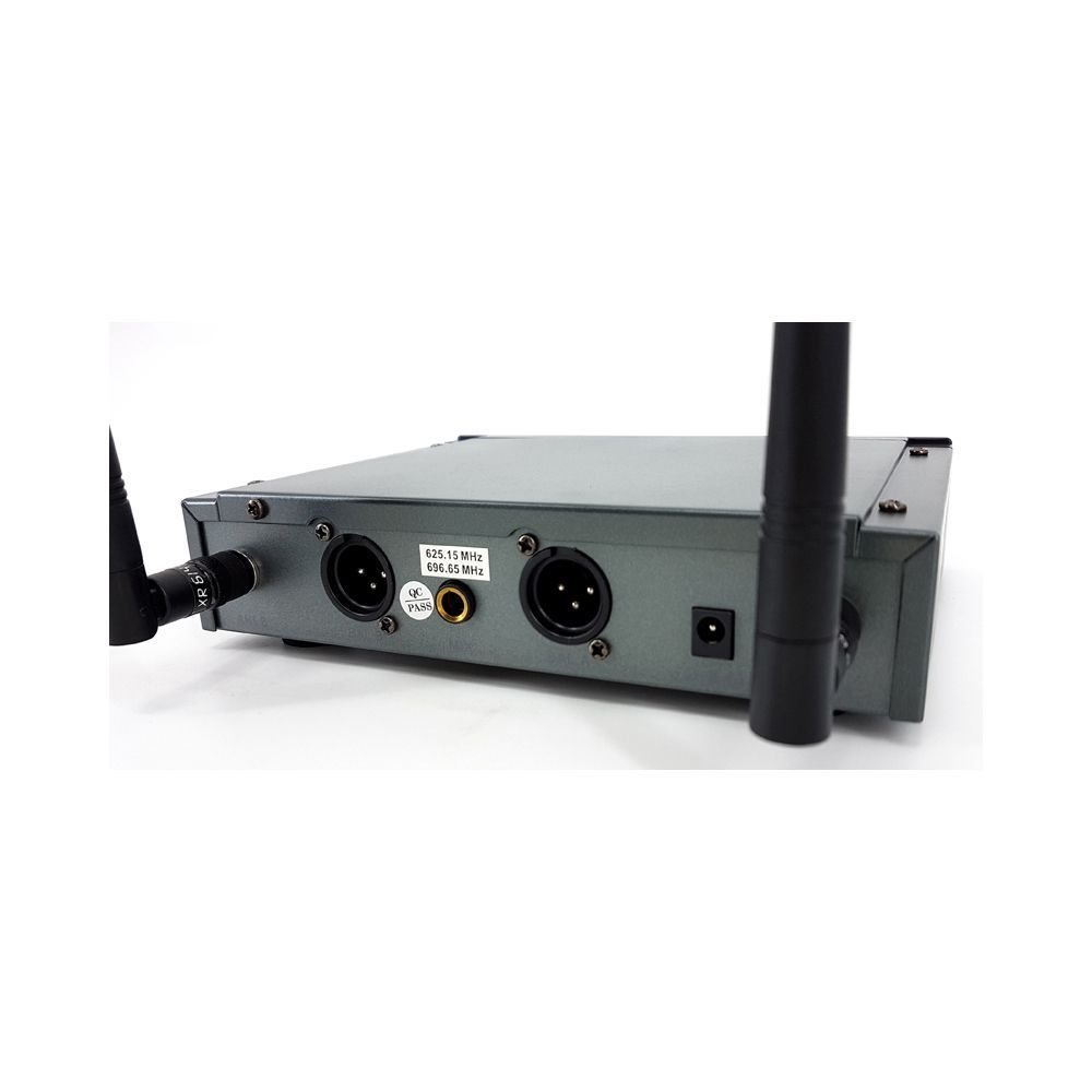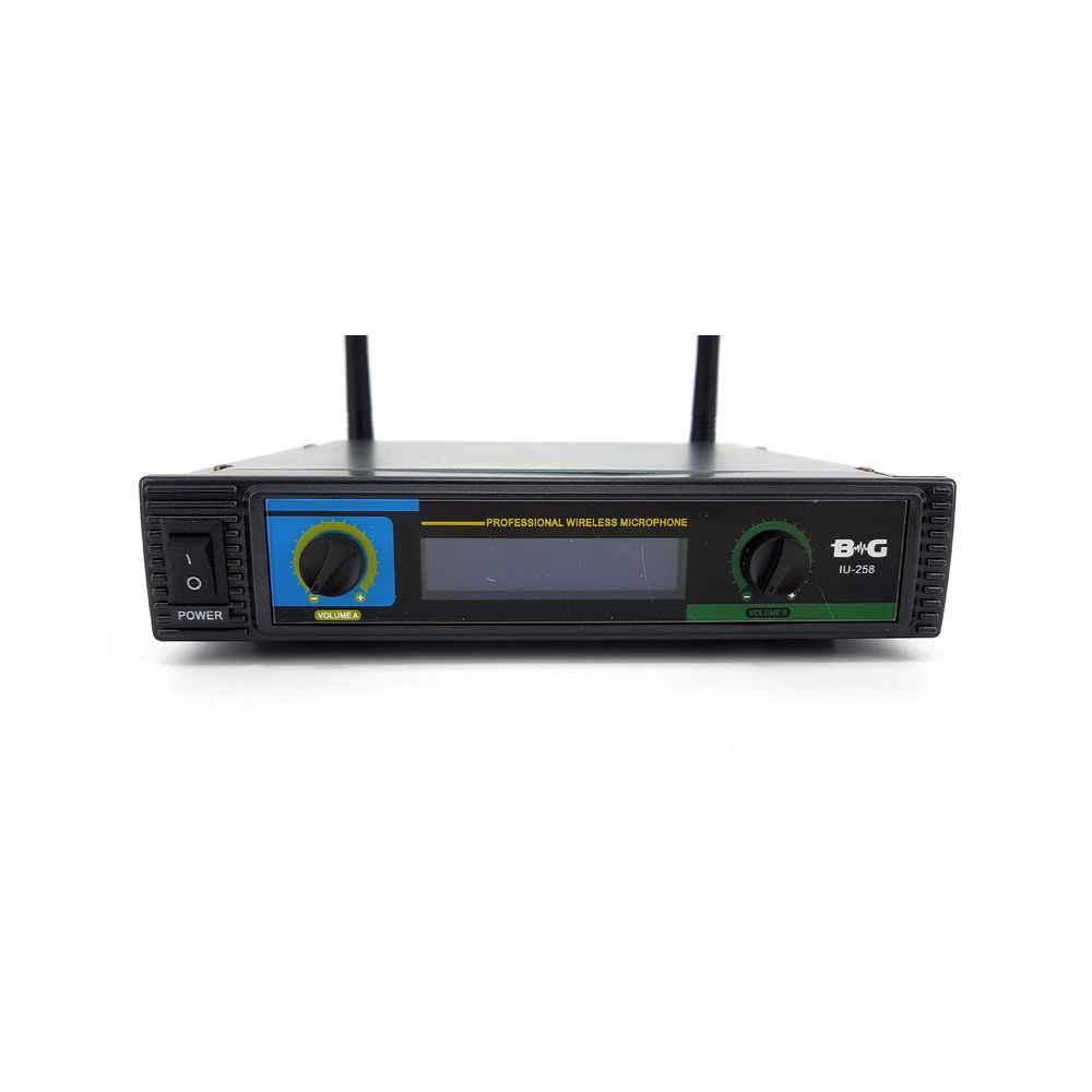 BG IU-258 представляет собой двухканальную вокальную радиосистему отличного качества. Озвучиваемый частотный диапазон радиосистемы лежит в спектре от 600 до 800 МГц. Комплектация: 1. Радиоприемник 2. Две антенны 3. Два беспроводных микрофона 4. Кабель Jack-Jack 5. Адаптер питания 6. Элементы питания типа АА х 4 Корпус радиоприемника представлен в прочном корпусе, на передней панели которого расположены элементы управления и ЖК-дисплей. Для качественного приема сигнала ресивер оснащен двумя антеннами. Энергообеспечение происходит с помощью адаптера. Беспроводные микрофоны обеспечивают защиту от обратной связи на сцене и меньшую чувствительность к посторонним звукам. Питание осуществляется от двух батареек типа АА, время работы может достигать 10 часов.