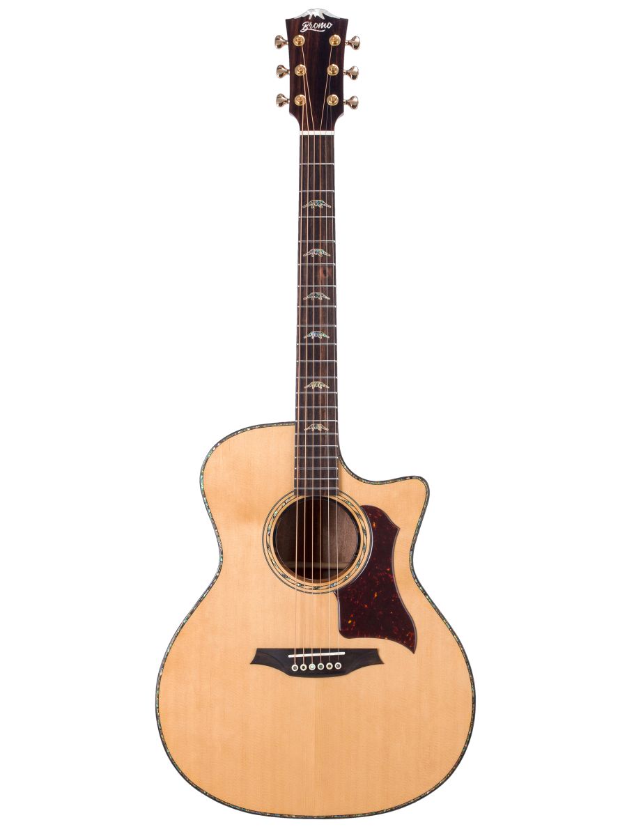 Bromo BAN2CE Гитара электроакустическая с вырезом Grand Auditorium, верхняя дека: цельная ель, нижняя дека и обечайка: огненный мовингу, гриф: махагони с двумя эбеновыми вставками, накладка грифа: макассарский эбен, двухсторонний анкер, колки: литье Mt. Bromo, позолоченные, электроника: Fishman “Sonitone”, лакированная, в чехле