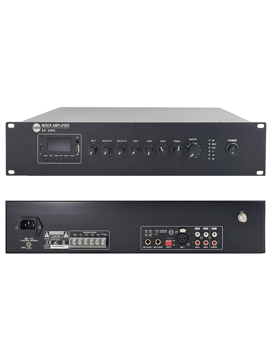 CMX Audio EA-240A Микшер-усилитель 240 Вт, Mp3 плеер, SD, FM тюнер, Bluetooth, 3 Mic, 2 Aux, 70V/100V/4-16ohm